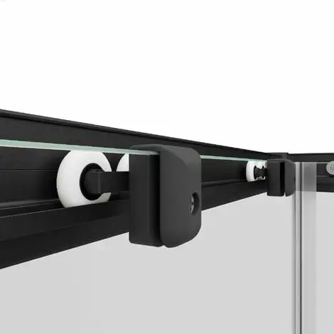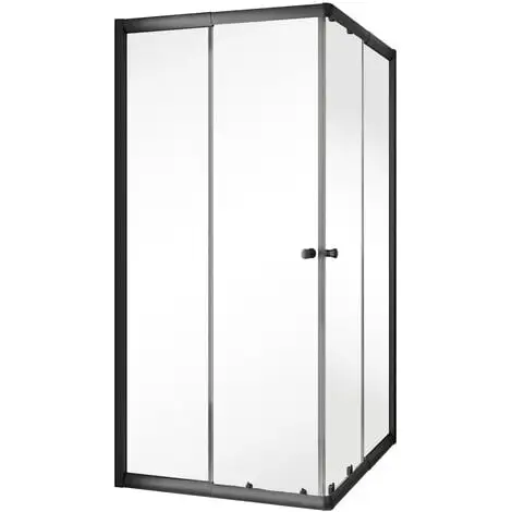 Accès d’angle droit avec portes coulissantes, profilés en noir, verre transparent