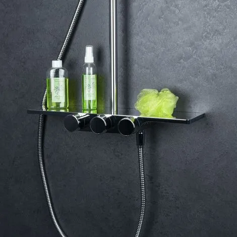 Colonne de douche avec thermostat intégré, 45 x 112 cm, pommeau rond orientable, douchette à main ronde, tablette intégré, aspect chromé