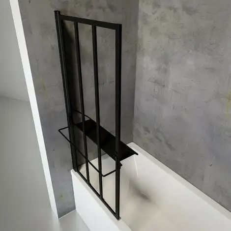 Pare-baignoire rabattable, 75 x 140 cm, verre transparent anticalcaire 4 mm, profilé noir, tablette et porte-serviettes inclus